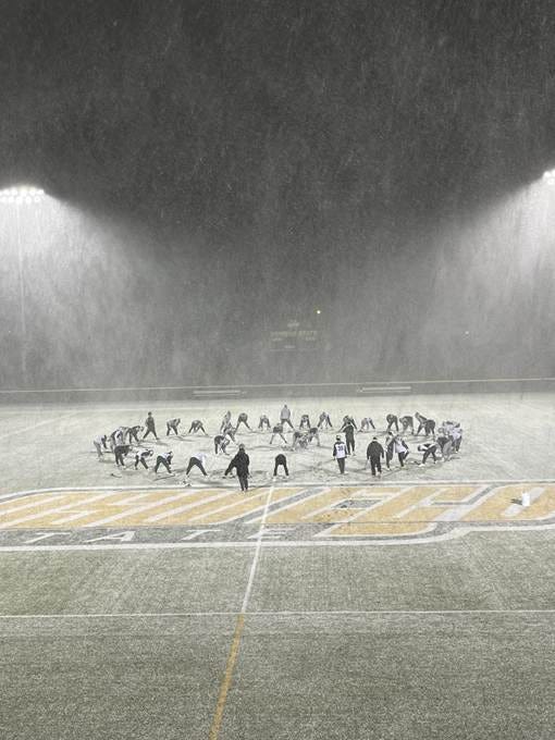 As we got ready for opening lineups and the National Anthem, the field was pretty much covered. Support staff started shoveling the sidelines. I wish I could remember who the refs were that day, but we met with Ithaca head coach Jeff Long and discussed what we would do. As I recall, Longman’s thoughts were typical of his uniquely laid-back demeanor – “I’m thinking you’re here, we’re here, and the refs are here. Let’s play.”